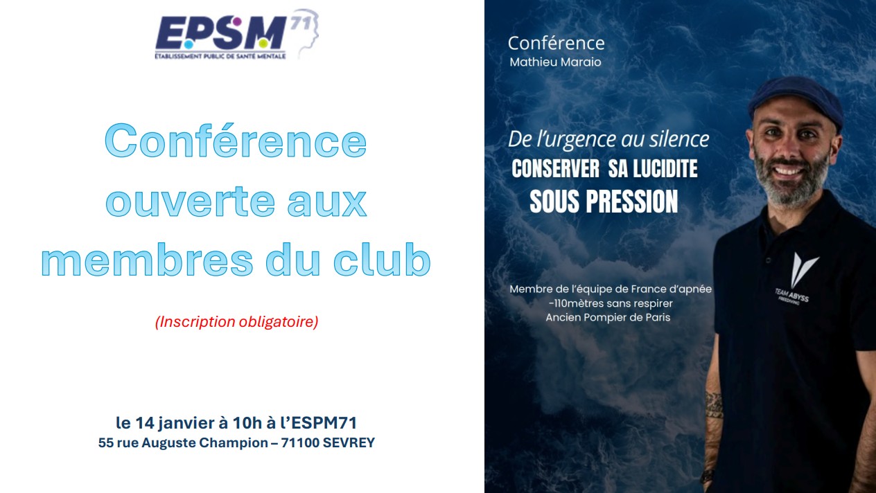 Mathieu Maraio, est apnéiste professionnel, membre de l’équipe de France, classé dans le top 10 mondial. Il est arrivé 6ème au championnat du monde 2022 et est champion de France 2023.De par ses qualités sur la maitrise de soi, il interviendra le mercredi 14 janvier auprès du personnel soignant de l’EPSM71 à Sevrey pour une conférence liée à la gestion du stress : Conserver sa lucidité sous pression.
