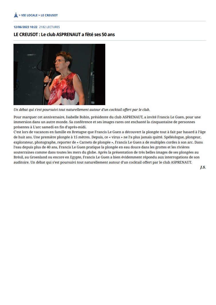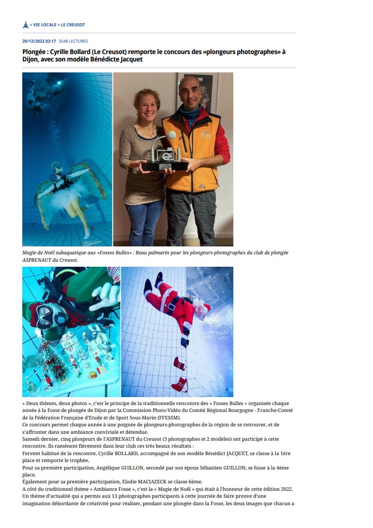 Article Creusot InfosPlongée : Cyrille Bollard (Le Creusot) remporte le concours des «plongeurs photographes» à Dijon, avec son modèle Bénédicte Jacquet